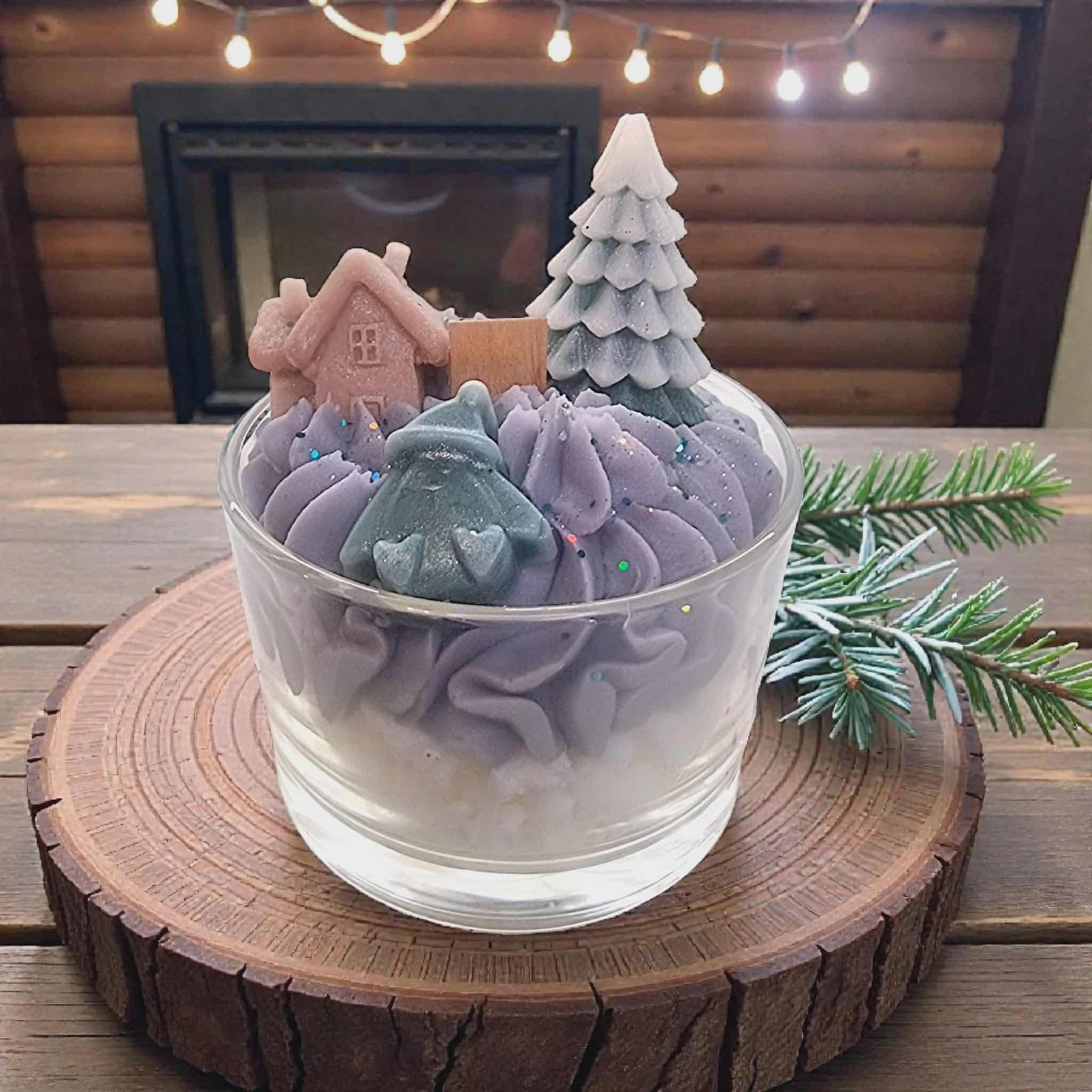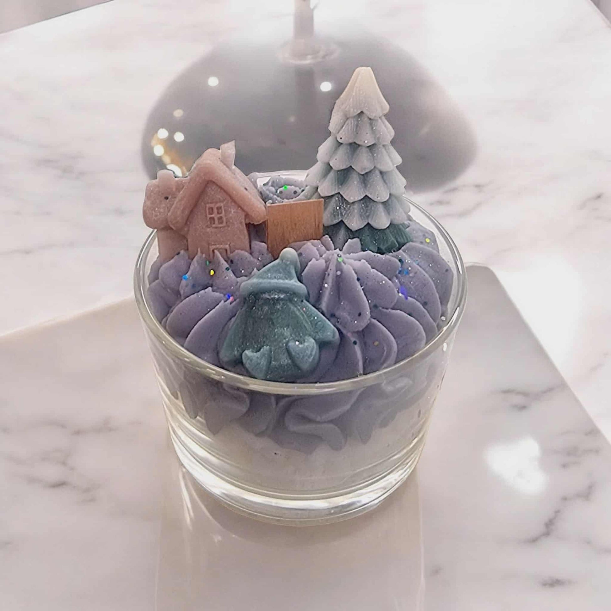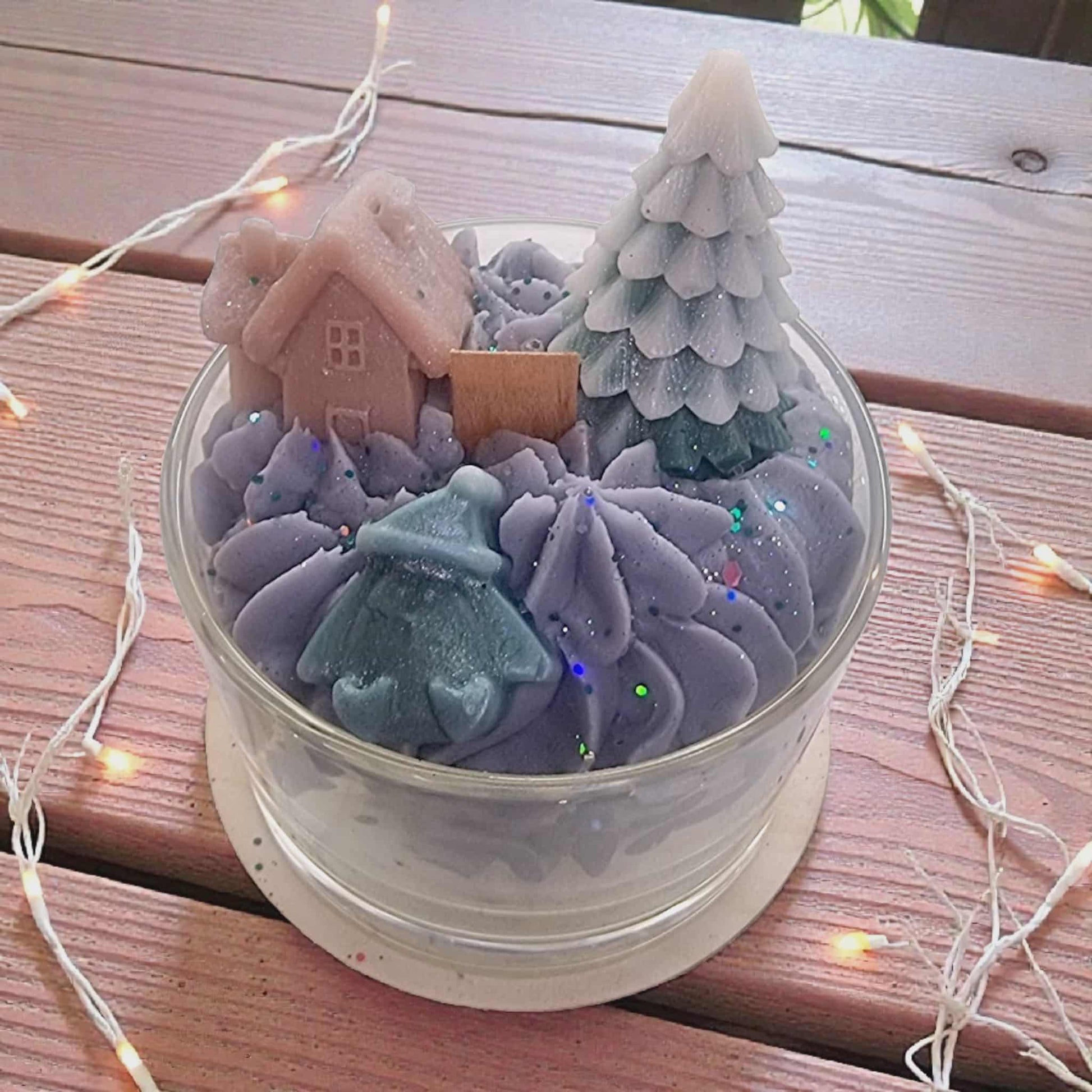 Το χειροποίητο κερί σόγιας Snowy Night δημιουργεί ένα παραμυθένιο σκηνικό με διακοσμητικά σε σχήμα χιονισμένου σπιτιού, χριστουγεννιάτικου δέντρου και χαριτωμένης φιγούρας, όλα φτιαγμένα από φυτικό κερί σόγιας.